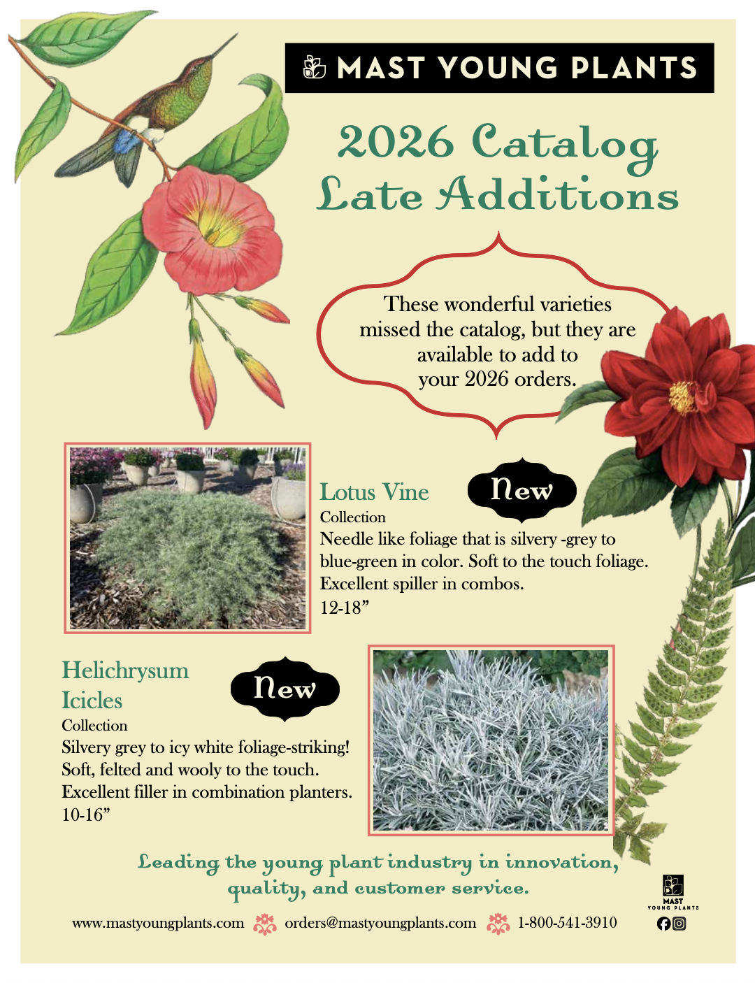 MYP is a young plant rooting station. We take cuttings from suppliers and farms from all over the world and sell the hand-stuck rooted liners through our broker partners. The printable reference sheets and flyers below provide additional information about our new varieties and ordering information for customers, brokers, and sales representatives.