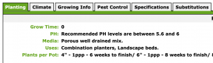Planting, growing, climate, pest control, and substitution recommendations are also available at the bottom of the screen for many varieties.